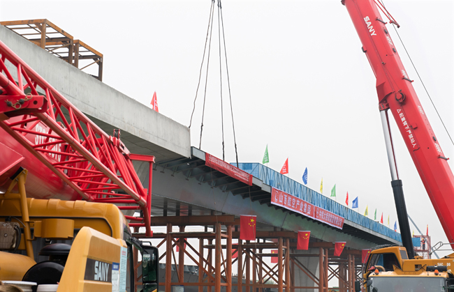 為確保首聯(lián)鋼箱梁精準安裝,建設單位山西航產集團聯(lián)合施工單位中鐵大橋局集團科學組織、精心謀劃,克服施工作業(yè)面有限、運輸距離遠等困難,圍繞安全質量管控、人材機調配等細節(jié)問題,多次組織設計、監(jiān)理、生產廠家等單位召開技術方案討論會,研究分析施工重難點,逐項梳理安全風險點,細化優(yōu)化各施工環(huán)節(jié)。正式吊裝前,對施工人員進行詳細的安全、技術、質量交底,嚴格落實檢查制度,進行“一吊一檢”,確保吊裝過程平穩(wěn)有序,順利實現(xiàn)首聯(lián)鋼箱梁成功吊裝。